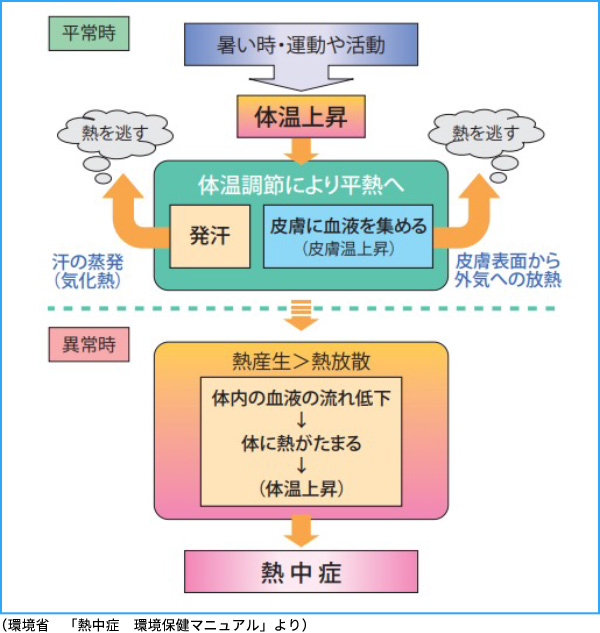 体内に溜まった体内に溜まった熱を体外に逃す方法(熱放散)には、皮膚の表面から直接熱を外気に逃がす放射や液体や固体に移す伝導、風によってその効率を上げる対流等があります。しかし、外気温が高くなると熱を逃しにくくなります。汗は蒸発する時に体から熱を奪います。高温時は熱放散が小さくなり、主に汗の蒸発による気化熱が体温を下げる働きをしています。汗をかくと水分や塩分が体外に出てしまうために、体内の水分・塩分が不足し、血液の流れが悪くなるので、適切な水分・塩分の補給が重要になってきます。(環境省 「熱中症 環境保健マニュアル」より)