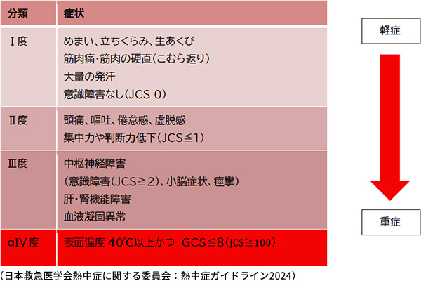 熱中症の症状に対しては、程度に応じて以下の手当てを参考にしてください。