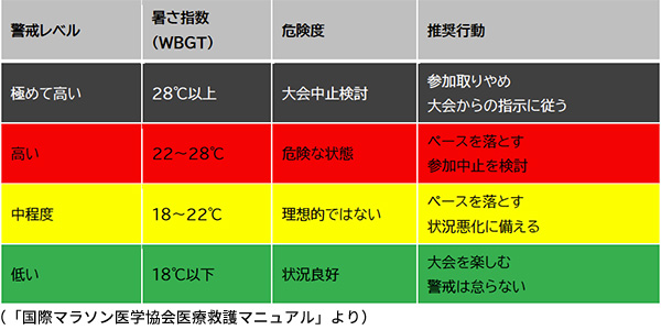 気温単体ではなく、人体へ影響を及ぼす複数の要素を取り入れた指標であるWBGT指数を用いたランナーの行動指針が出ています。以下の表を参照し、気温・湿度が高いときはペースを落とす/リタイアを検討してください