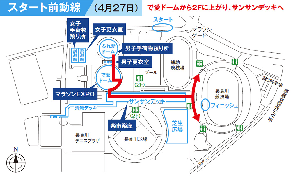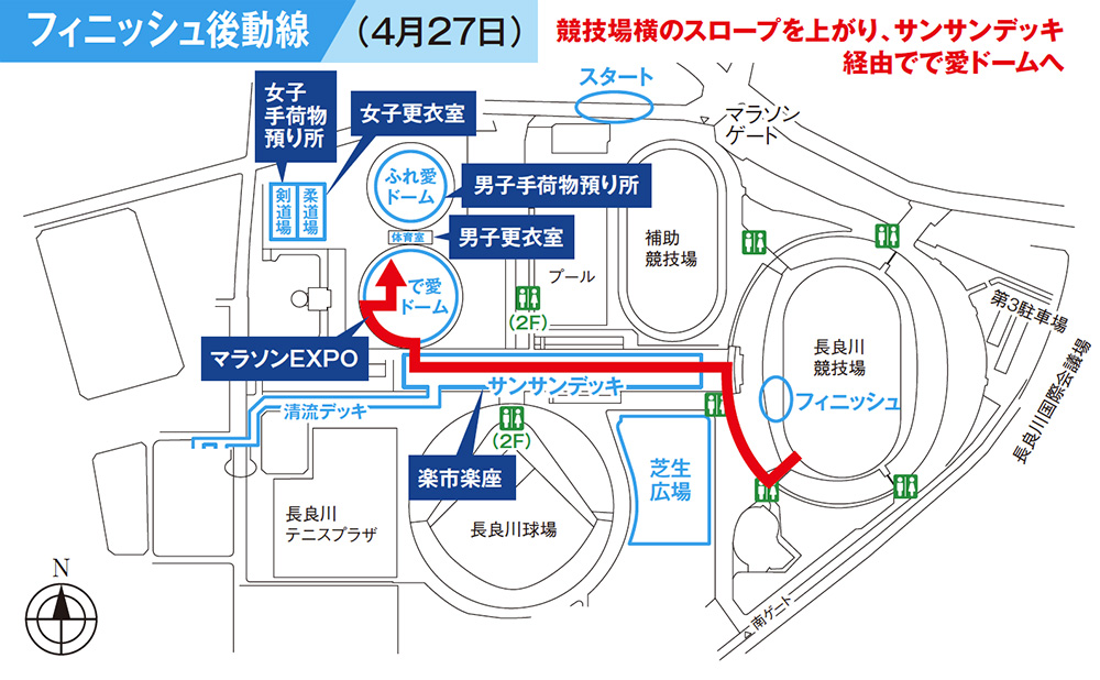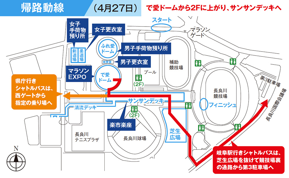 - マラソンEXPO(で愛ドーム)の出入口は、サンサンデッキ上2階入口に変更(マラソンEXPO出口はすべて2階に変更)