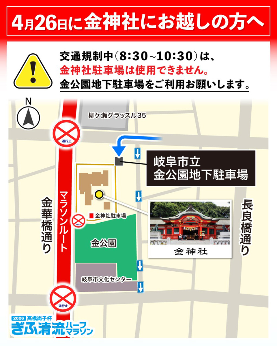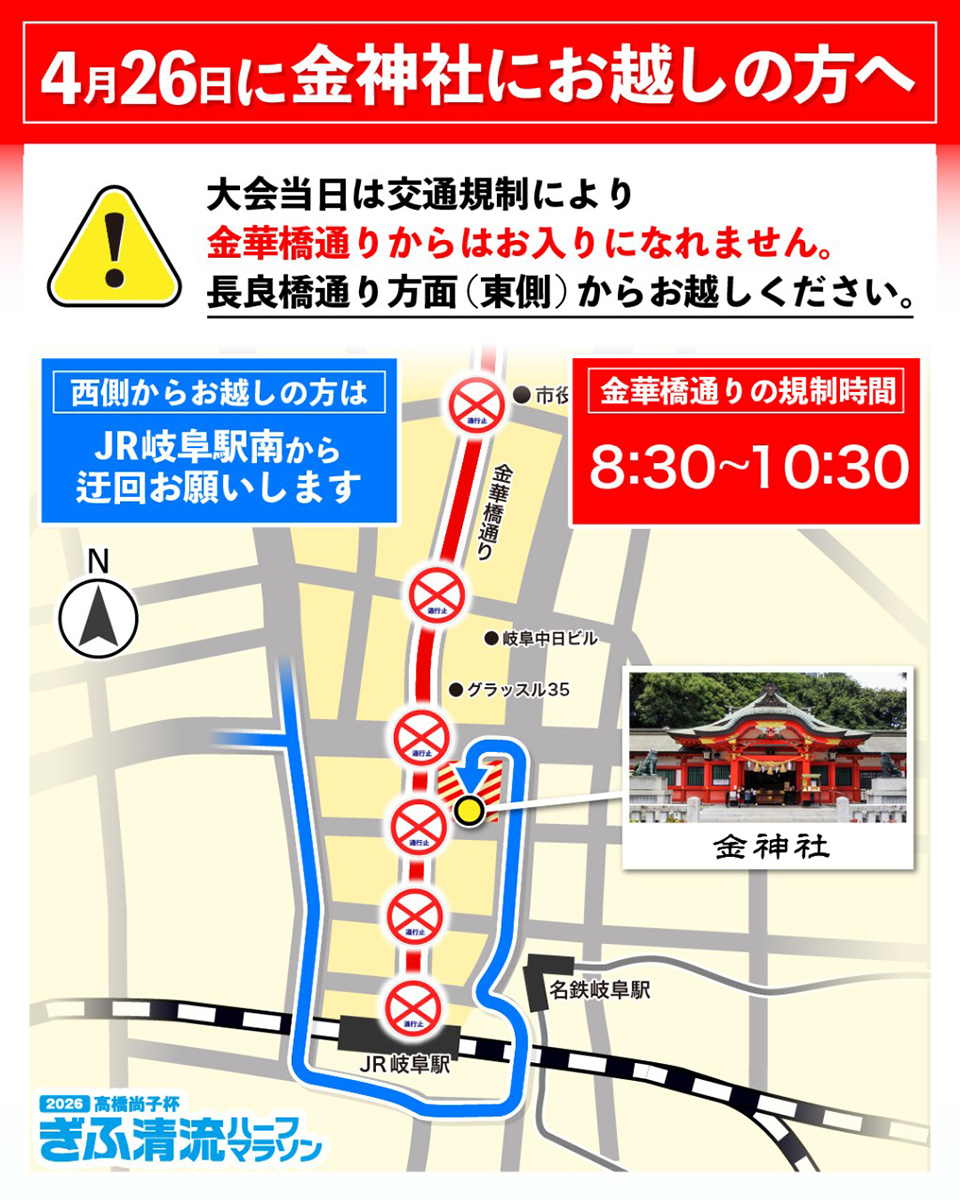 4月26日、大会当日は交通規制がかかりますので、金華橋通りからはお入りになれません。