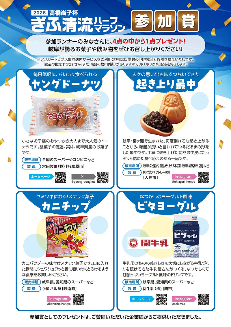 ぎふ清流ハーフマラソンでは、参加ランナーの皆さまへ、岐阜が誇るお菓子・飲み物を参加賞としてご用意しています。